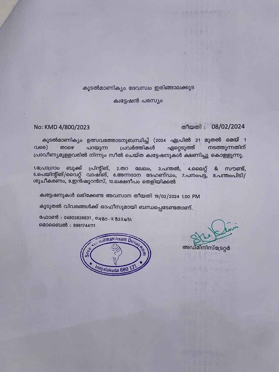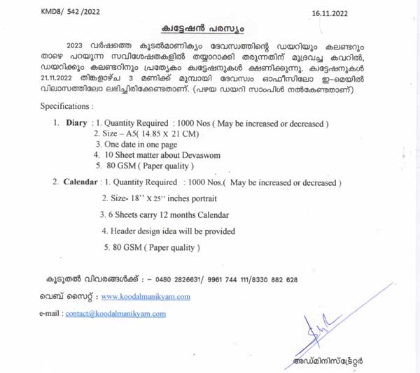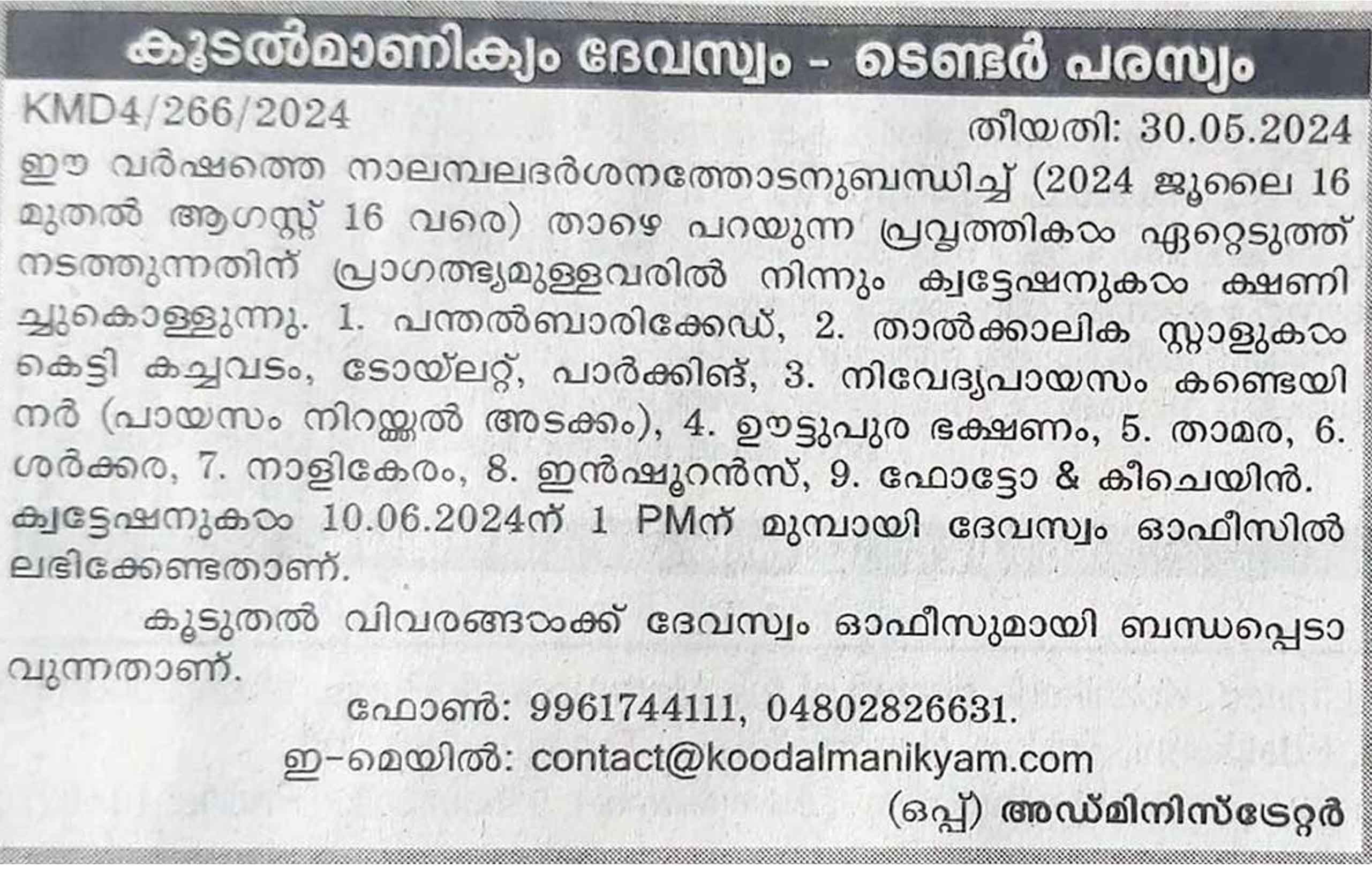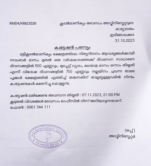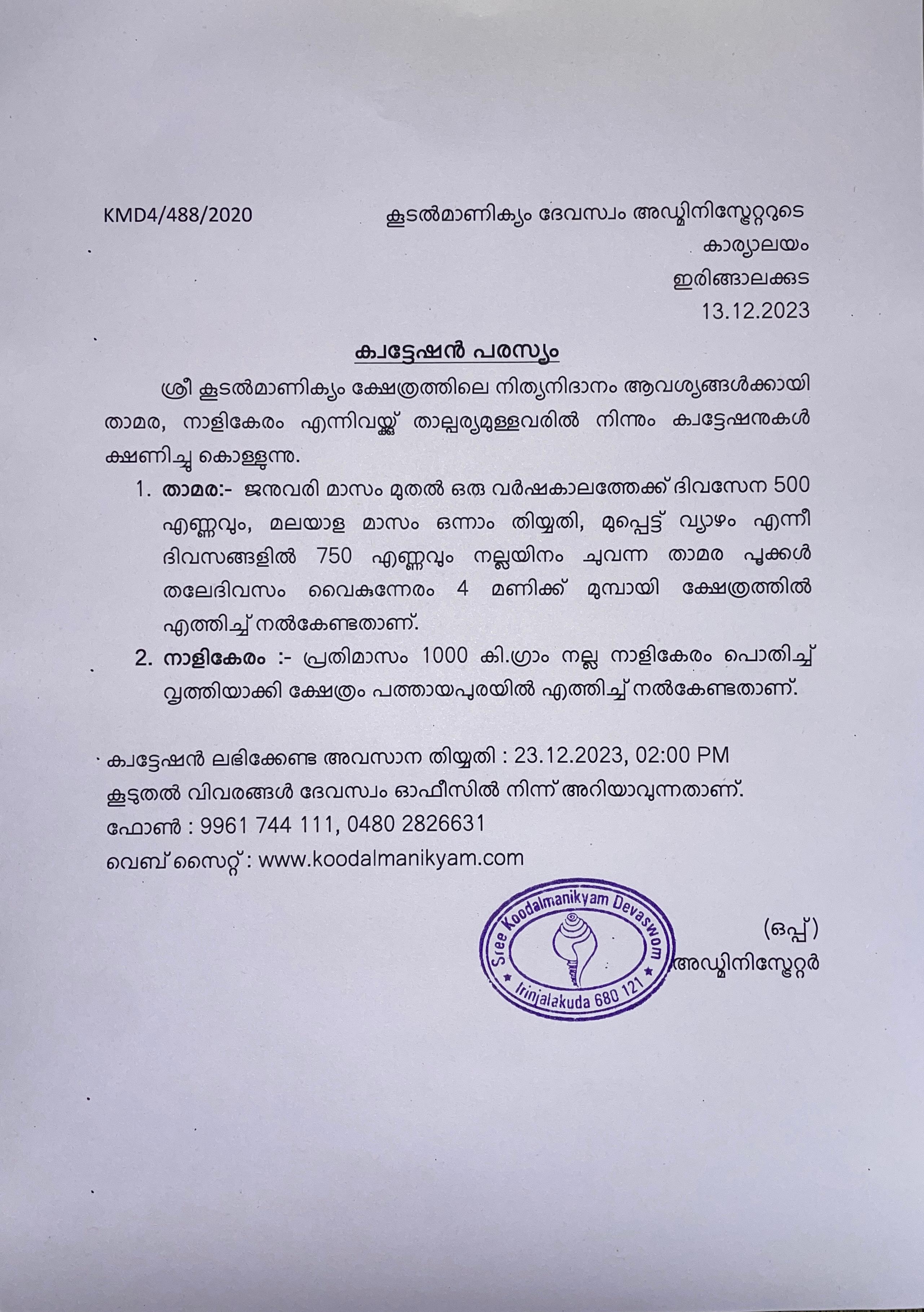 കൂടൽമാണിക്യം ദേവസ്വം ഇരിങ്ങാലക്കുട ക്വട്ടേഷൻ പരസ്യം - നാളികേരം